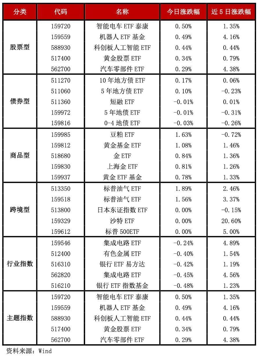 今日不同类型ETF产品中走势排名前5的基金如下表所示,其中,股票型ETF涨幅最高的3只ETF产品分别为智能电车ETF泰康(159720)、机器人ETF基金(159559)、科创板人工智能ETF(588930),今日收益率分别为0.50%、0.49%和0.44%。